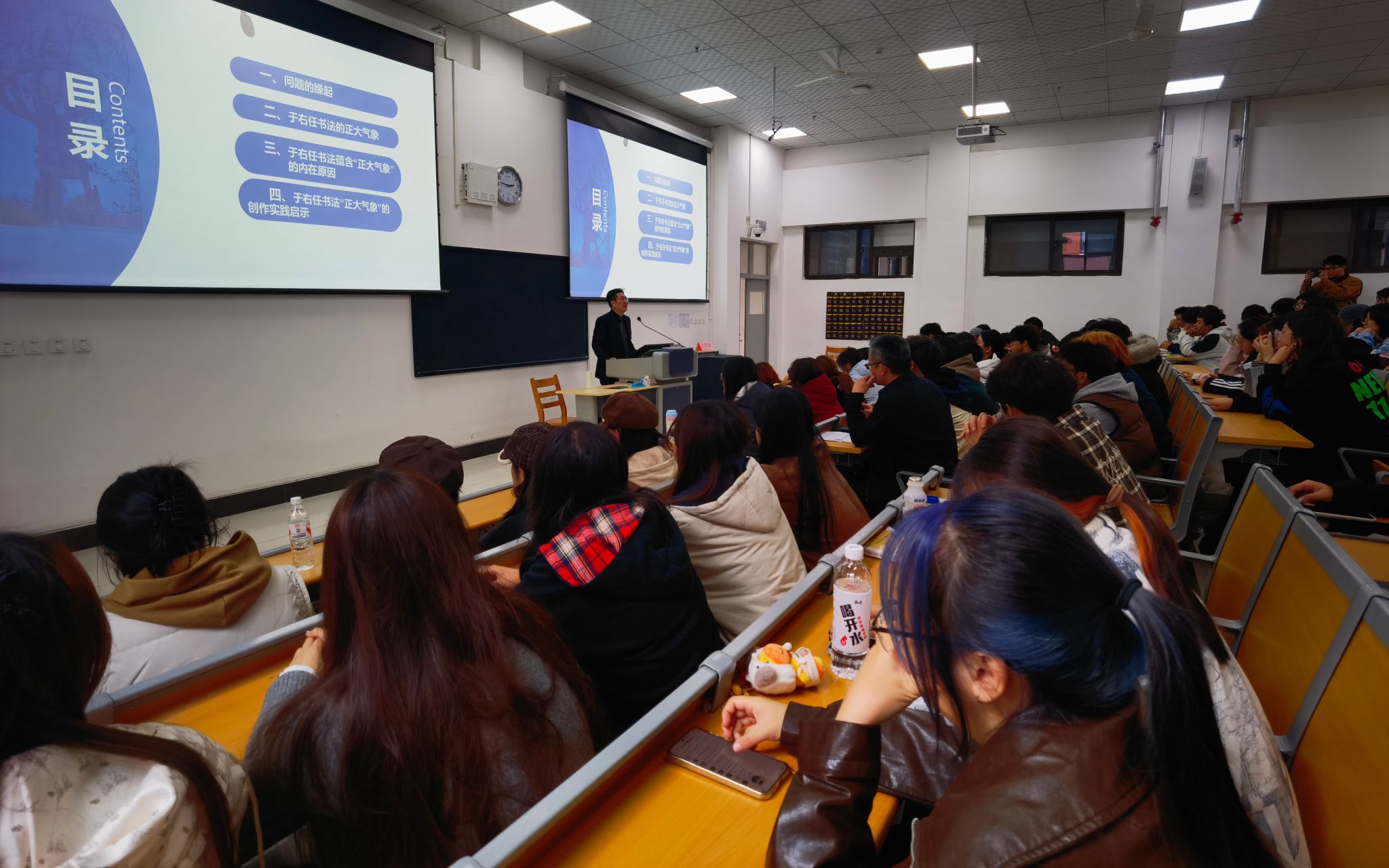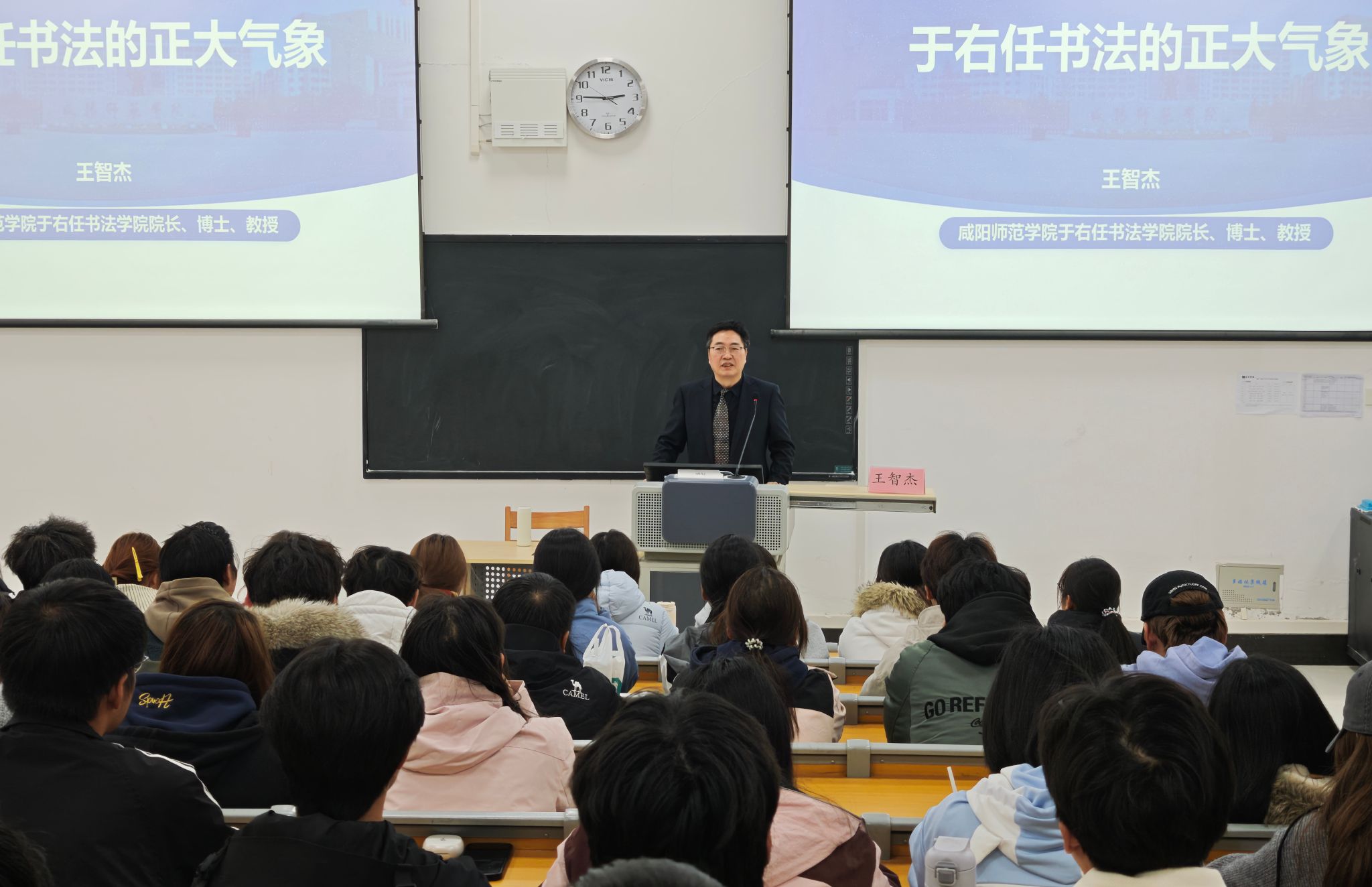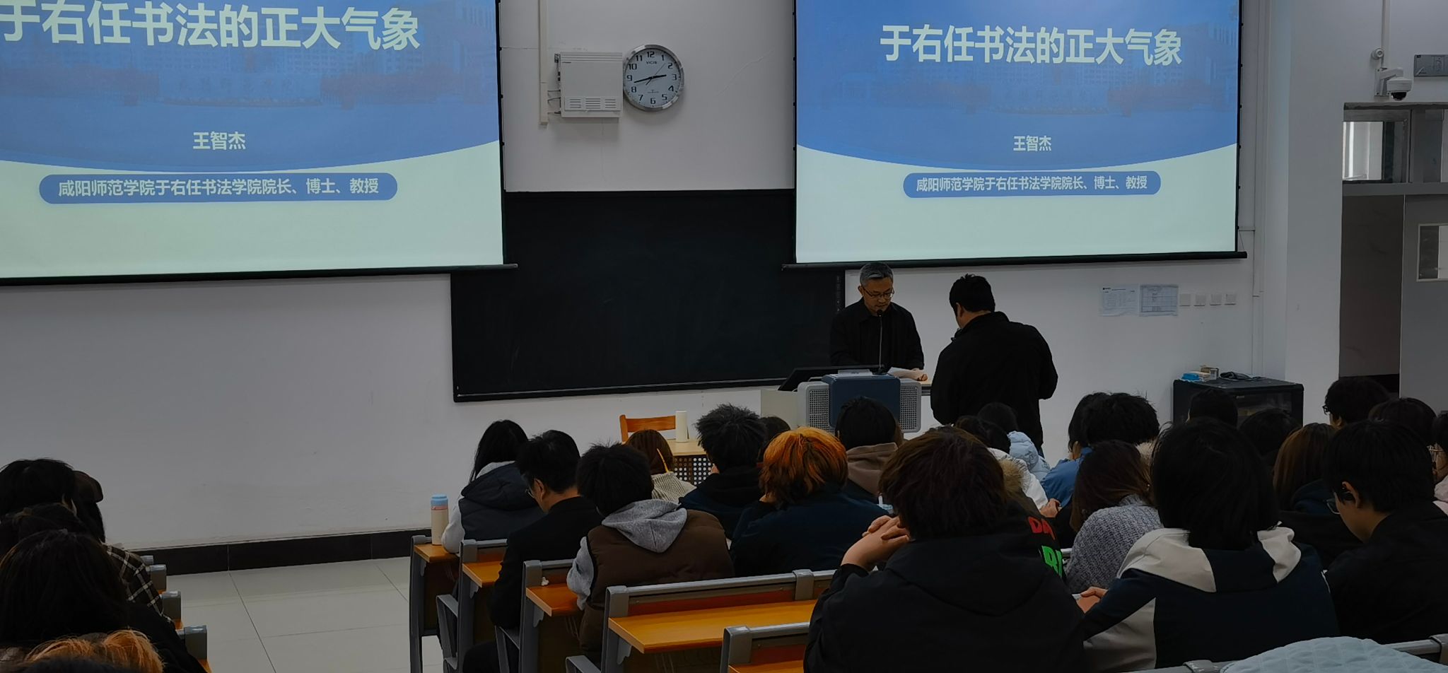 11月3日,于右任书法学院院长王智杰教授赴渭南师范学院富平校区为美术学院书法学专业师生做了题为《于右任书法的正大气象》的学术报告。渭南师范学院美术学院院长石海彬主持报告会。
